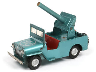 longueur : 19,5 cm - avec moteur à friction & système de mise à feu du canon (fonctionnent) - manque personnage - quelques éclats & frottements par endroits - une extrémité de pare-chocs déformée - pare-brise dégrafé à plusieurs endroits - légèrement encrassé