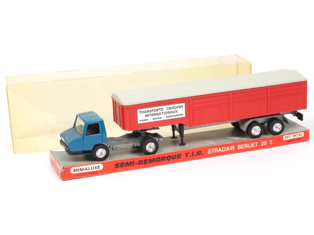 MINIALUXE (FRANCE) BERLIET STRADAIR Semi-remorque fourgon bâché 'TRANSPORTS GROUPES INTERNATIONAUX' bleu canard, rouge, bâche grise