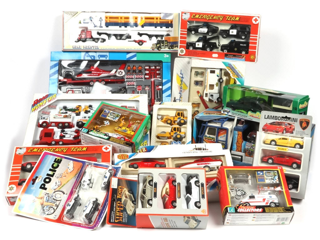 différentes échelles - plastique & métal - comprend notamment les marques : GOZAN,CARARAMA, MC TOY & ROAD TOUGH - on y retrouve notamment : camions, voitures, figurines & accessoires - boîtes & blisters en états 'a à c' (quelques boites déformées)