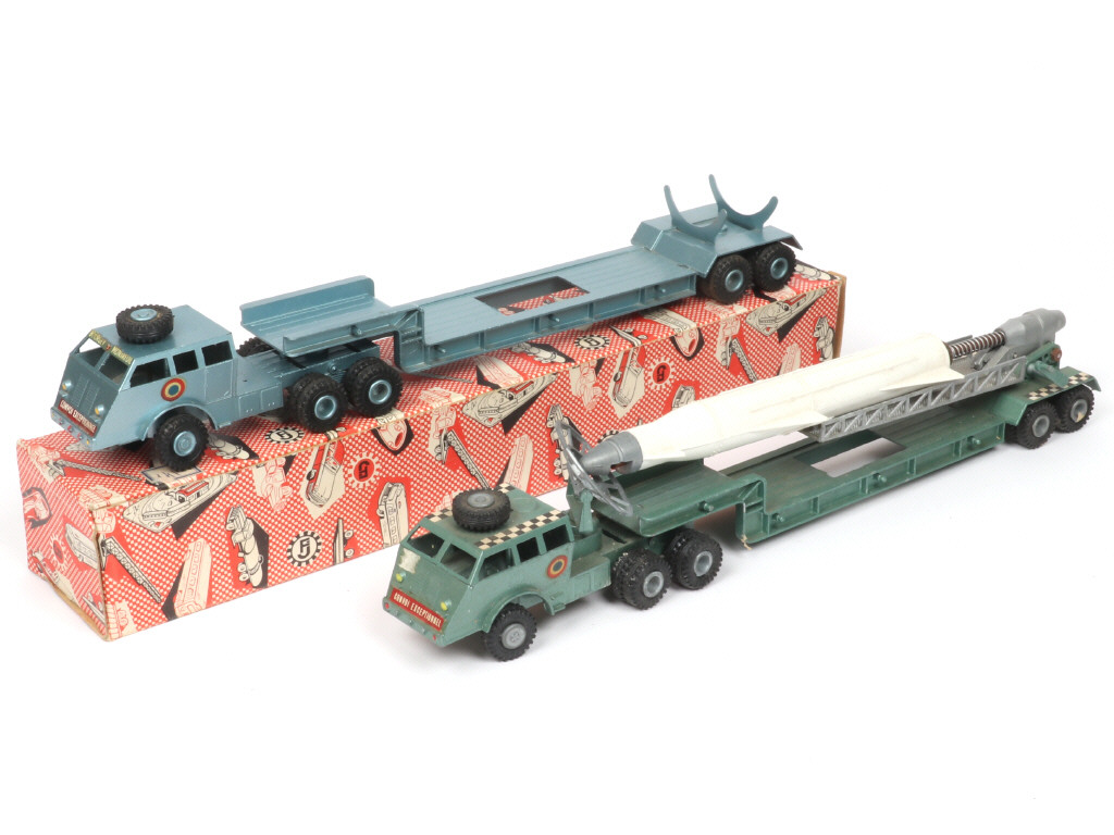 comprend les versions : porte pipe-line 'BOURGEY-MONTREUIL' (un axe de roues déformé, boîte état 'b' avec accrocs & petites déchirures) & convoi de lancement de fusée spatiale (quelques traces d'oxydation, système de lancement à revoir) - quelques accessoires manquants