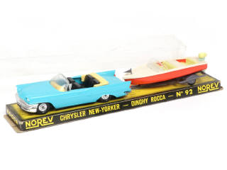 NOREV (FRANCE) 92 CHRYSLER NEW YORKER avec hors-bord ROCCA sur remorque bleu, orange & blanc cassé
