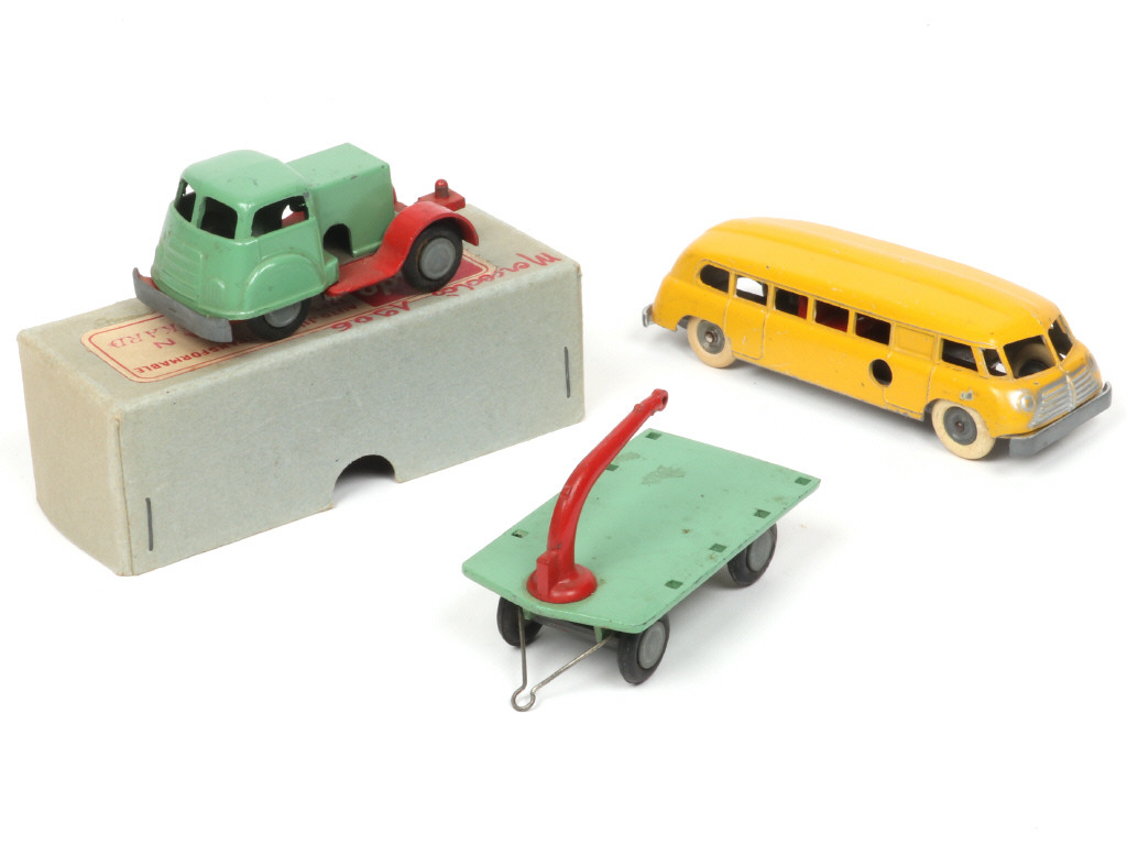 comprend : autocar de voyages & tracteur routier (trace de métal fatigue sur le toit) avec remorque - pneus séchés - on y joint un couvercle de boîte de la marque 'ROYAN/PACKARD' en état 'b' (légèrement décoloré avec annotations)