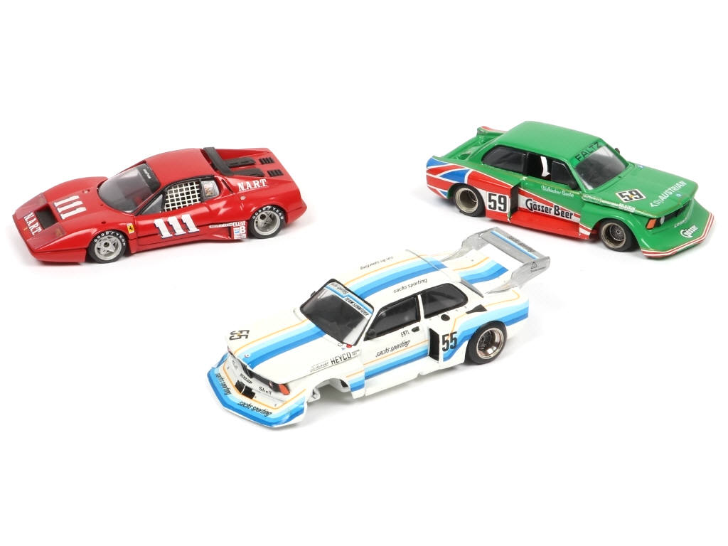 comprend : FERRARI NART & BMW 320 (dont une avec une roue manquante & l'autre sans aileron, parties cassées) - on y retrouve les marques : MINICHAMPS & A.M.R. X
