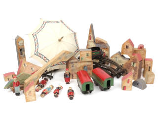 différentes compositions - comprend notamment : figurines, éléments de construction & 2 voitures de voyageurs - on y retrouve notamment les marques : BON-DUFOUR & MECCANO - avec manques parties cassées, ternies & oxydées (plus ou moins importants suivants les modèles) - on y joint un parapluie de poupée en état 'C' (légèrement jauni) & une guérite (non présentée sur la photo)