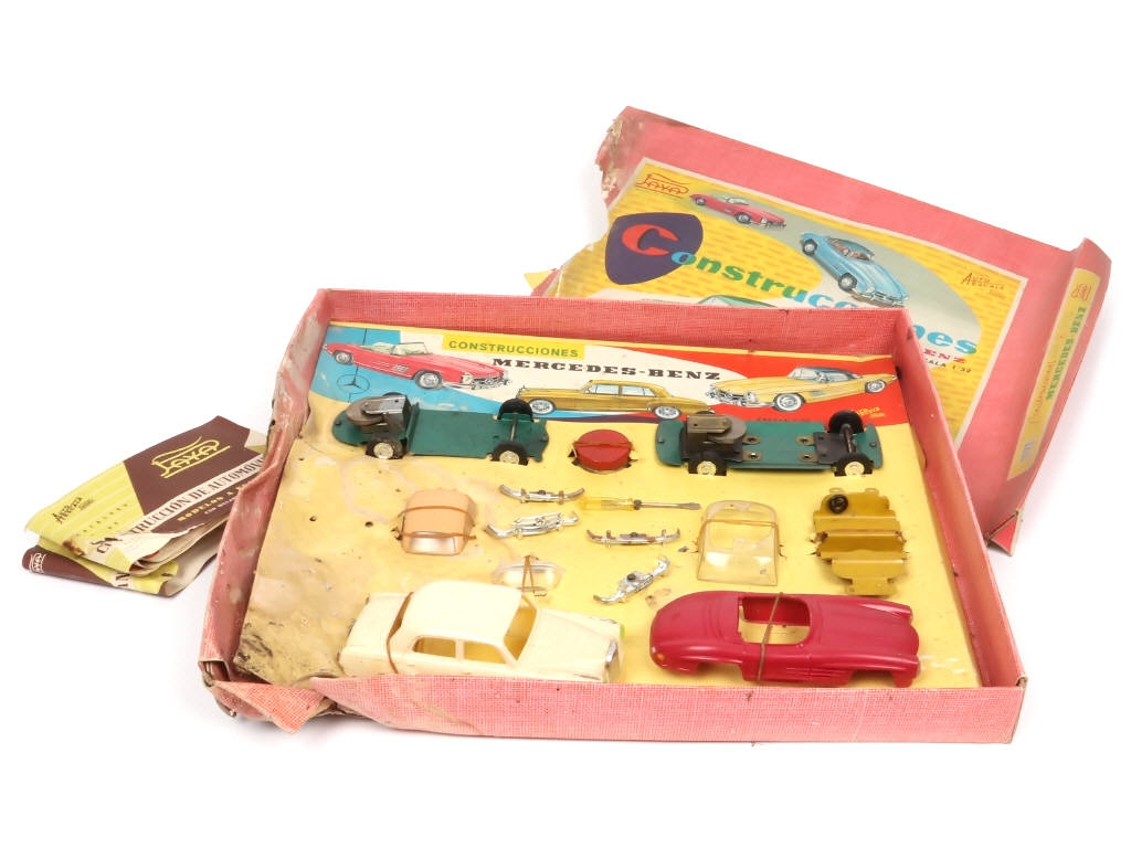 dimensions : 40 x 35 cm - avec notice - contient différents éléments & accessoires permettant la réalisation de 2 modèles de MERCEDES (échelle 1/32ème), avec moteurs à friction (non testés) - quelques manques sur les parties chromées - quelques petits éléments manquants - ensemble présenté sur support cartonné encrassé & déformé