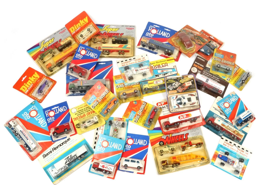 différentes petites échelles - comprend notamment les marques : DINKY, FILTOYS, ERTL & EFSI - on y retrouve notamment les modèles : camions semi-remorques & voitures de courses - blisters légèrement encrassés (jamais ouverts)