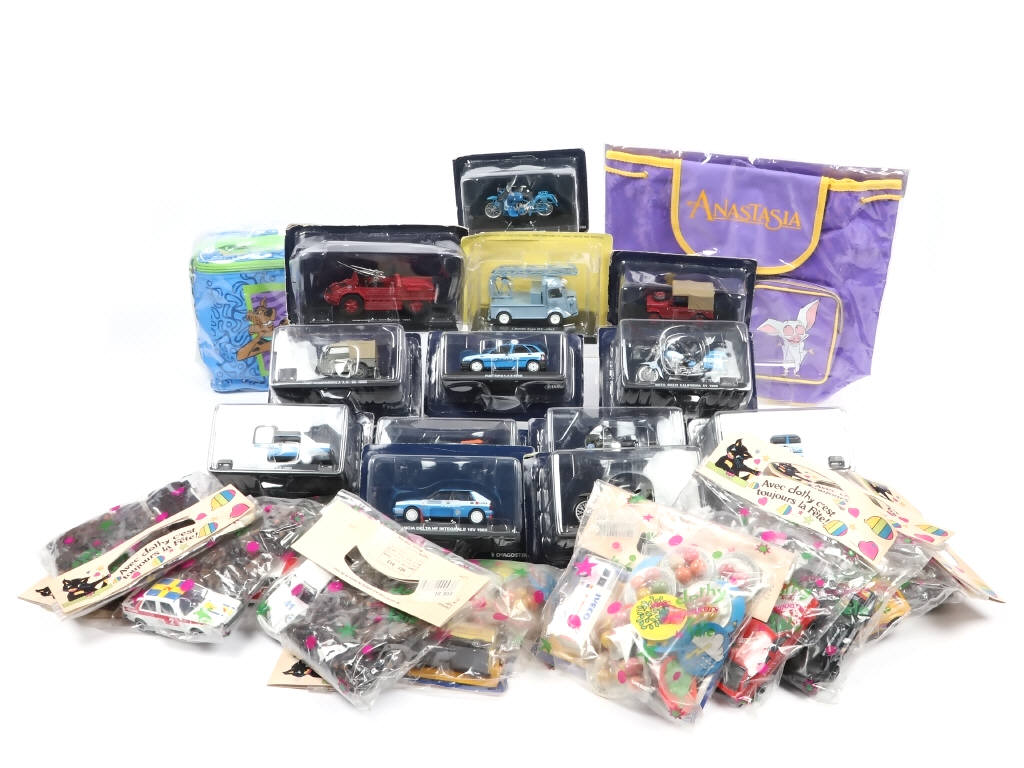 comprend notamment les marques : CORGI & DEAGOSTINI - comprend notamment les modèles FIAT TIPO POLIZIA, ALFA 80 POLIZIA, MOTO GUZZI POLIZIAFIAT CAMPAGNOLA A.A. 59 (1959) & véhicules en sachet avec paquets de bonbons (attention date de péremption dépassée) - on y joint 2 sacs ( SCOOBY-DOO & ANASTASIA)