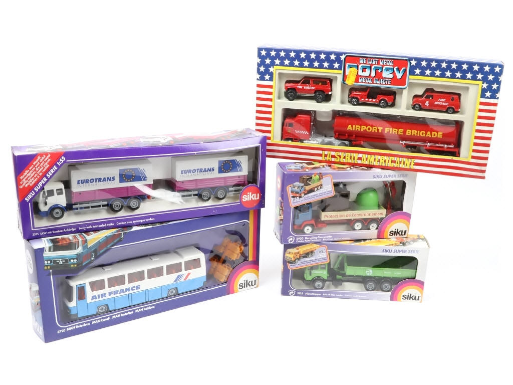 comprend les marques : NOREV & SIKU - on y retrouve notamment les modèles : Camion avec remorques tanden, camion porte-containers & coffret SERIE AMERICAINE "FIRE BRIGADE" - boîtes en état 'b à c'
