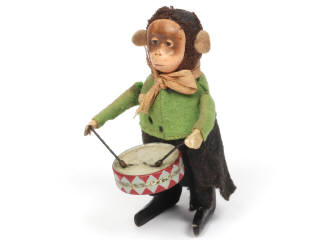 hauteur 11 cm - moteur à clef (fonctionne, sans clef) - en action, le singe joue du tambour tout en tournant sur lui-même - tissu plus ou moins défraîchi par endroits (notamment sur la tête, quelques petits manques de matière par endroits) - petits frottements sur le tambour