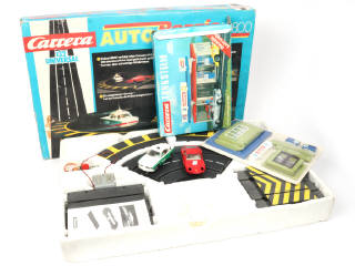 dimensions : 77,5 x 49 cm - non testé - contenu en état de 'B' à 'D' - contient notamment : BMW 'POLIZEÏ', PORSCHE 944, différentes éléments de piste & accessoires - avec manques & parties cassées - on y joint un garage de la marque (référence 51606) en état 'A'-'b' (éléments sous blister jamais ouverts)
