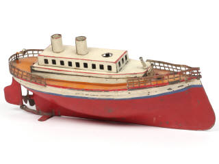 DIVERS Bateau en tôle peinte rouge, blanc cassé & ocre