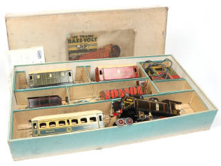 non testé - coffret décoloré & taché (petits manques sur l'illustration) - contenu non conforme - contient : une locomotive vapeur type 220 'NORD' (état 'C'), tender (état 'C'), voiture de voyageurs PULLMAN (état 'C', toit en état 'D'), fourgon à bagages (état 'D', traces d'humidité sur un côte de carrosserie), postal (état 'D'), tombereau (état 'C') & une sous-station électrique (état 'B') - avec quelques manques, traces d'oxydation, petites restaurations & parties déformées (plus ou moins importants suivant les modèles)