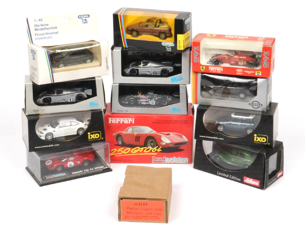 comprend notamment les modèles : MERCEDES, FORD, FERRARI, MINI COOPER & BMW - on y retrouve notamment les marques : MODELS MAX, ONYX, IXO, JOUEF EVOLUTION & GAMA - on y joint un kit à monter de la marque JIELGE - boites légèrement poussièreuses
