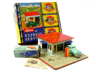 contient une station-service SHELL en tôle lithographiée & une voiture 'MIRAKOCAR 1001' dans sa propre boîte - avec notice, clef & cale de boîte - en action, la voiture rentre par une des portes du garage puis ressort de l'autre côté, puis elle tourne autour de la pompe à essence & recommence son cycle - SUPERBE !