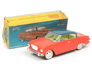 longueur 19 cm - moteur à friction (fonctionne) - micro fêlures sur le vitrage - petits manques de pellicule chromér sur le pare-choc avant - importantes traces d'humidité sur la boîte