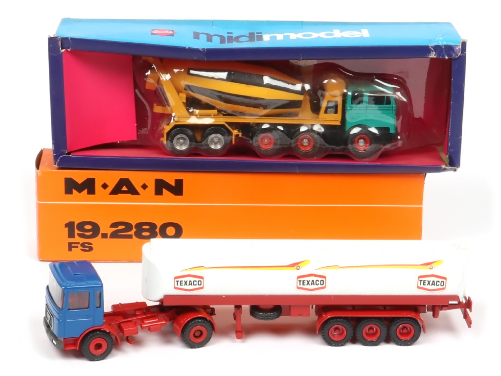 comprend : toupie à béton 'LIEBHERR' (phares à positionner) & MAN 19.280 FS 'TEXACO' (avec éléments manquants - échelle cassée à recoller) - on y retrouve les marques : GESCHA & CONRAD - en boite en états 'b' & 'c'