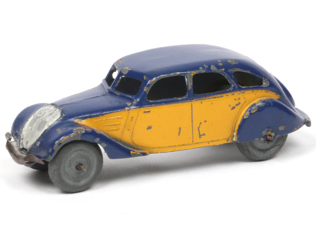 DINKY TOYS (FRANCE) 24L PEUGEOT 402 'TAXI' (version sans plancher & avec roues zamac) bleu soutenu & jaune d'or