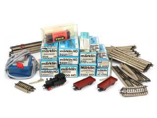 comprend notamment : wagons-marchandises, voitures-voyageurs, rails, aiguillages, heurtoirs, transformateur (non testé) & locomotive à vapeur 030 (non testé) - boites en états 'b' & 'c' (3 modèles sans) - on y joint un wagon-marchandises de la marque TRIX