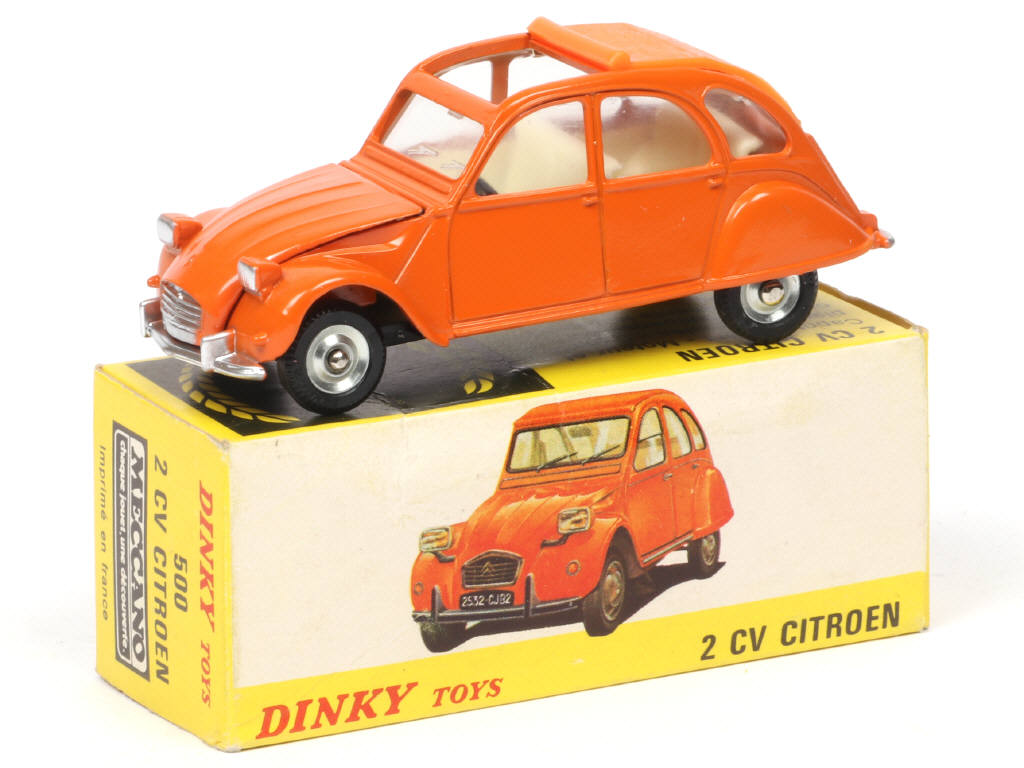 DINKY TOYS (FRANCE) 500 CITROËN 2CV Décapotée (made in SPAIN) orange avec plancher vissé & plaque minéralogique arrière jaune