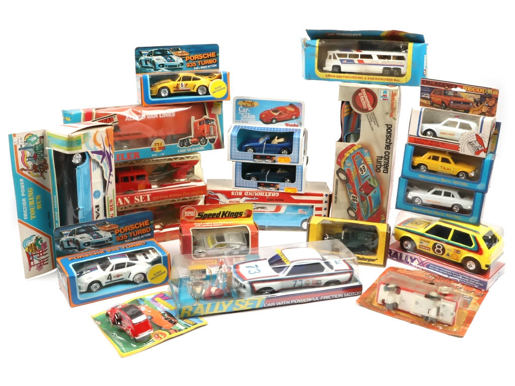 comprend notamment les marques : MATCHBOX, JOUSTRA & CORGI - on y retrouve notamment les modèles : camions de pompiers, ambulances, voitures de course & bus - possibilité de petits manques & parties cassées - boîtes légèrement encrassées en états 'b à c'