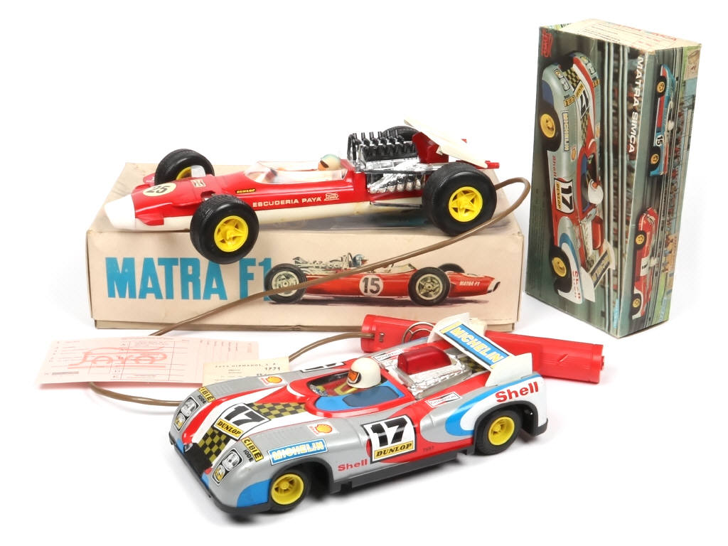 comprend : F1 (longueur 41 cm) - avec moteur à piles, direction (fonctionnent), permis de conduire du club PAYA & bon de contrôle (boite avec petites déformations) & SIMCA-MATRA (boite en état 'c')