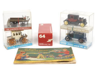 comprend : LANDAU PARK ROYAL 1912, AUSTIN 1911, MERCEDES voiture personnelle d'Hitler, ERSTER-DAIMLER 1896 & ERSTERN-BENZ omnibus - on y retrouve les marques : MINIALUXE, RIO & CURSOR MODELL - un couvercle de boite avec rayures - on y joint un catalogue MECCANO 1938-39 en état 'c'