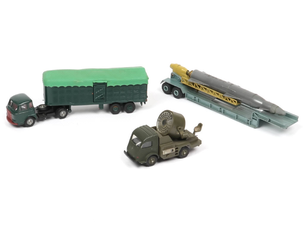 comprend : RENAULT 2,5 tonnes projecteur (non testé - manque personnage - avec traces de colle), 2 remorques (un mécanisme non testé) & tracteur SAVIEM - on y retrouve les marques : FRANCE JOUETS, C.I.J & DINKY TOYS
