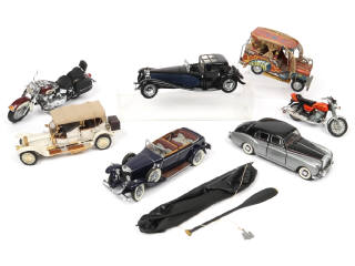 échelle 1/24ème - comprend notamment les modèles : ROLLS ROYCE, MERCEDES, BUGATTI, KAWASAKI & HARLEY DAVIDSON - on y retrouve notamment les marques : FRANKLIN MINT (principalement) & POLITOYS - avec petits manques & parties cassées