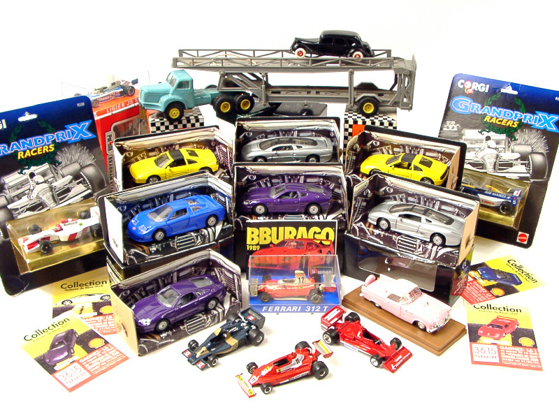 modèles reproduisant les marques : ALFA ROMEO, RENAULT, FOOTWORK, ASTON MARTIN, JAGUAR, FERRARI, LIGIER, FORD, BUGATTI, CITROËN, WOLF & BERLIET - on y retrouve les marques : SHELL, POLISTIL, YAXON, RIO, CORGI, CHAMPION & NOREV - on y joint 4 autocollants SHELL & un catalogue BBURAGO - les 2 modèles NOREV sont en état 'C' & 'R' - 2 boîtes en état 'c'