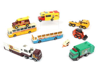 MAJORETTE (FRANCE) Ensemble de 8 véhicules & une remorque