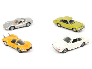 comprend les modèles : FERRARI (manque aileron arrière & un autocollant) & BMW - on y joint une MERCEDES 230 SL de la marque MERCURY (une extrémité de pare-chocs cassée à recoller)