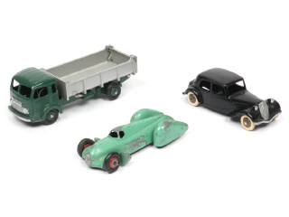 comprend : SIMCA CARGO benne basculante (version avec roue de secours rivetée, extrémité du levier de basculement déformée), CITROËN 11BL (état 'R') & AUTO UNION de course (état 'E')