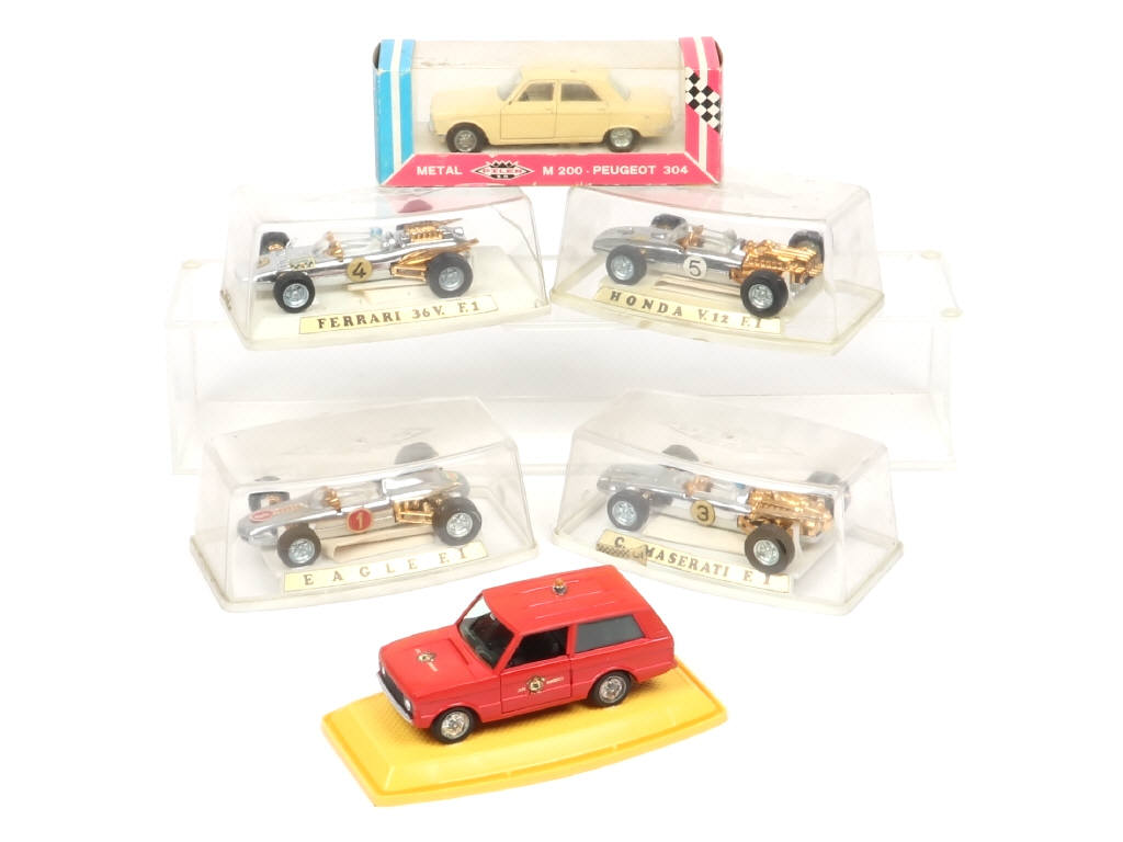 comprend : MASERATI, EAGLE, HONDA, FERRARI, PEUGEOT (un éclat majeur sur le toit) & RANGE ROVER 'JEFE BOMBEIROS' - quelques petits manques de peinture sur le casque des pilotes - quelques réactions entre certains pneus & les supports - un couvercle de boite avec fêlure