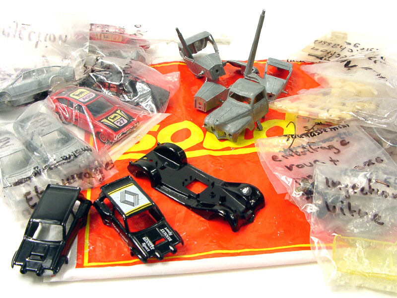 comprend différentes carrosseries & pièces détachées correspondant au divers stades de la fabrication d'un modèle - on y joint un sac plastique de la marque - cet ensemble provient de l'usine