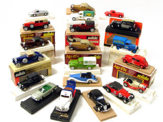série 'AGE D'OR' - modèles reproduisant les marques : CITROËN, MERCEDES, DUESENBERG, DELAGE, DODGE, DELAHAYE, RENAULT, JAGUAR & PANHARD LEVASSOR - 7 pièces avec suremballages en carton (dont 5 en état 'c') & 2 en séries limitées - manque sigle de calandre sur un modèle