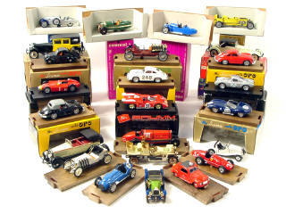 miniatures reproduisant les marques : FIAT, PORSCHE, FERRARI, TALBOT LAGO, DARMONT, ISOTTA FRACHINI, BEDELIA, THOMAS, FORD, BENZ, BUGATTI, JAGUAR, MORGAN & SANFORD - on y retrouve les marques BRUMM & RIO - 3 modèles sans boîte dont un en état 'C'