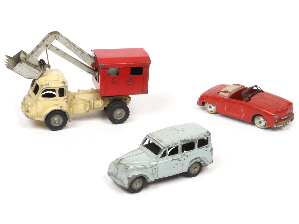 comprend : PANHARD DYNA JUNIOR 1953 (manque capote - pare-brise déformé), RENAULT 300 KG & 120 CV camion-pelle (mécanisme fonctionne) - oxydation par endroits - pneus séchés dont certains endommagés