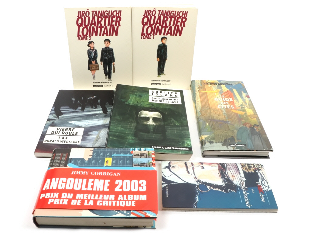 EO - très bon état général - comprend : QUARTIER LOINTAIN T1 & 2, SHUTTER ISLAND, PIERRE QUI ROULE, MOI J'ATTENDS, L'ABECEDAIRE DE LA BD, JIMMY CORRIGAN & LE GUIDE DES CITES - quelques traces de lecture