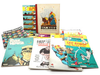 comprend notamment : 8 brochés promotionnels TOTAL, ALI BABA ET LES 40 VOLEURS (EO), LA GUERISON DES DALTONS (EO), 2 exemplaires de PILOTE ANNUEL, PIF GADGET n°500 & CORTO MALTESSE (1ere série brochée DL 1981 - traces d'usure) - très bon état général