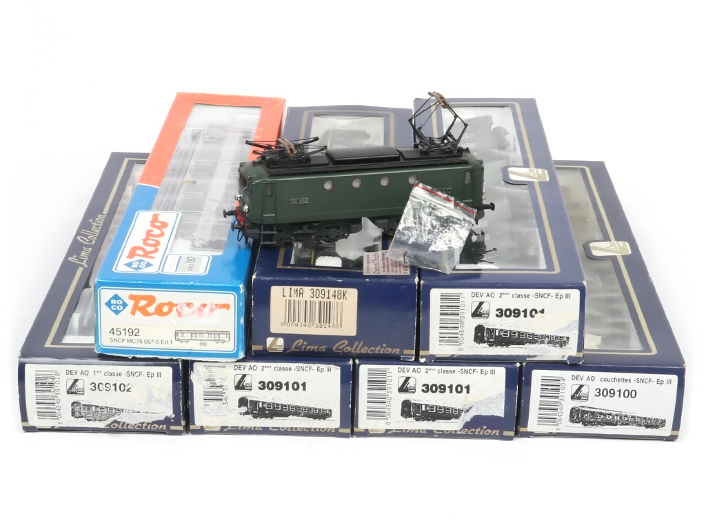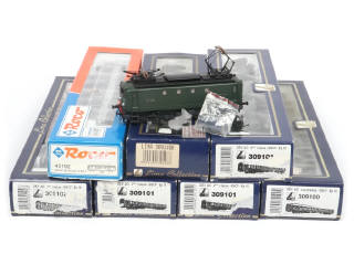 comprend notamment : motrice électrique BB-8104 (non testé - avec sachet d'accessoires - sans boite) & voitures-voyageurs 1ère & 2ème classe - on y retrouve les marques : RIVAROSSI, LIMA & ROCO - quelques manques de papier sur certaines boites (états 'b' & 'c')