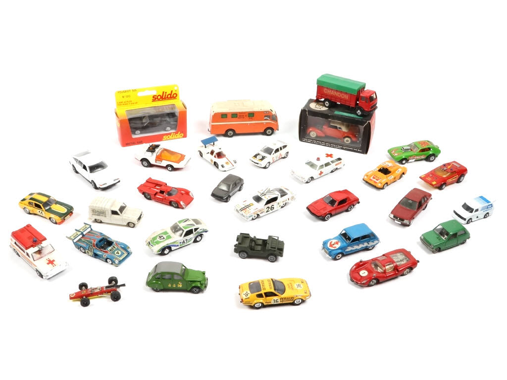 différentes échelles - comprend notamment les marques : SCHUCO, MEBETOYS, GAMA, DINKY TOYS, MATCHBOX & SOLIDO - 2 modèles en boîtes en états 'b' & 'c' - carrosseries plus ou moins encrassées - possibilité de petits manques & parties cassées