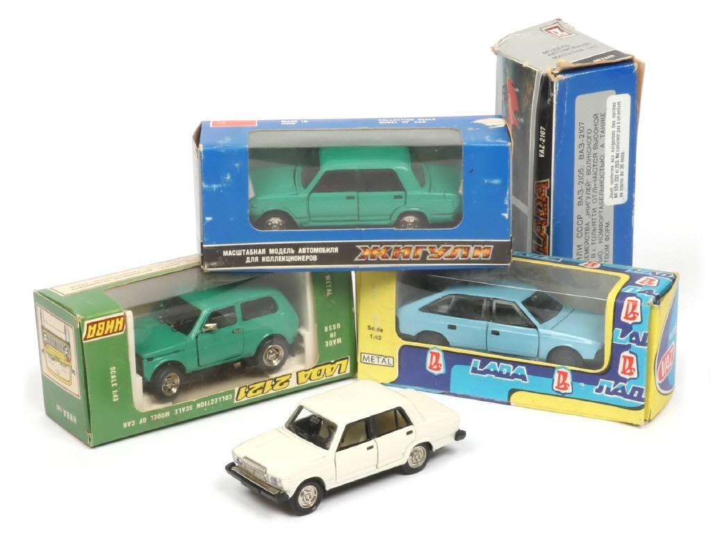 comprend les modèles : LADA NIVA 2121, GAZ 2117 (2 exemplaires dont un en état 'D' avec importantes traces de métal fatigue) & MOSCKVITCH 2141 (boîte non conforme) - les boîtes sont en états 'b' & 'c'