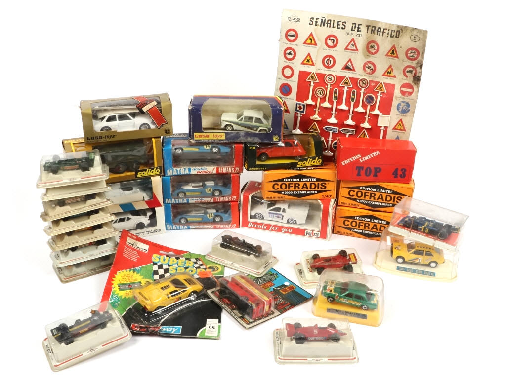 comprend notamment les marques : PILEN, SOLIDO, LUSO-TOYS, MIRA & CHAMPION - on y joint une planche de panneaux de signalisation de la marque RICO (manque un morceau de carton dans le bas) - boîtes encrassées & traces d'humidité en états 'b' à 'c'