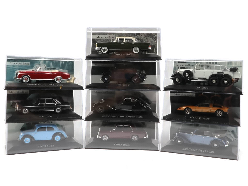 collection LA LÉGENDE MERCEDES-BENZ - comprend notamment les modèles : 180D (1954), 230 Cabriolet D (1939) & 220 SE Convertible (1958)