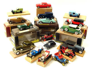 série 'AGE D'OR' - modèles reproduisant les marques : DUESENBERG, RENAULT, MERCEDES, CADILLAC, TALBOT, JAGUAR, ROLLS ROYCE & HISPANO SUIZA - 7 modèles avec suremballages en carton - une boîte-vitrine en état 'c'