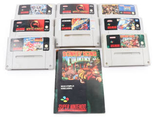jeux en français - testés : fonctionnent - comprend : MORTAL KOMBAT, ROBOCOP III (étiquette déchirée dans un coin), SUPER SMASH TV, AXELAY, MORTAL KOMBAT, EARTH DEFENSE FPRCE, DONKEY KONG COUNTRY 2 & DONKEY KONG COUNTRY (avec mode d'emploi) - cartouches plus ou moins encrassées