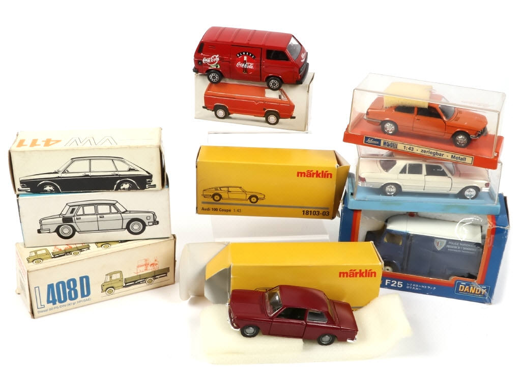 comprend notamment les marques : MARKLIN (réédition), TOMICA DANDY, SCHUCO MODELL & KDN - on y joint une boîte vide FORD TSF "SIKU" - boîtes en états 'b' à 'c'