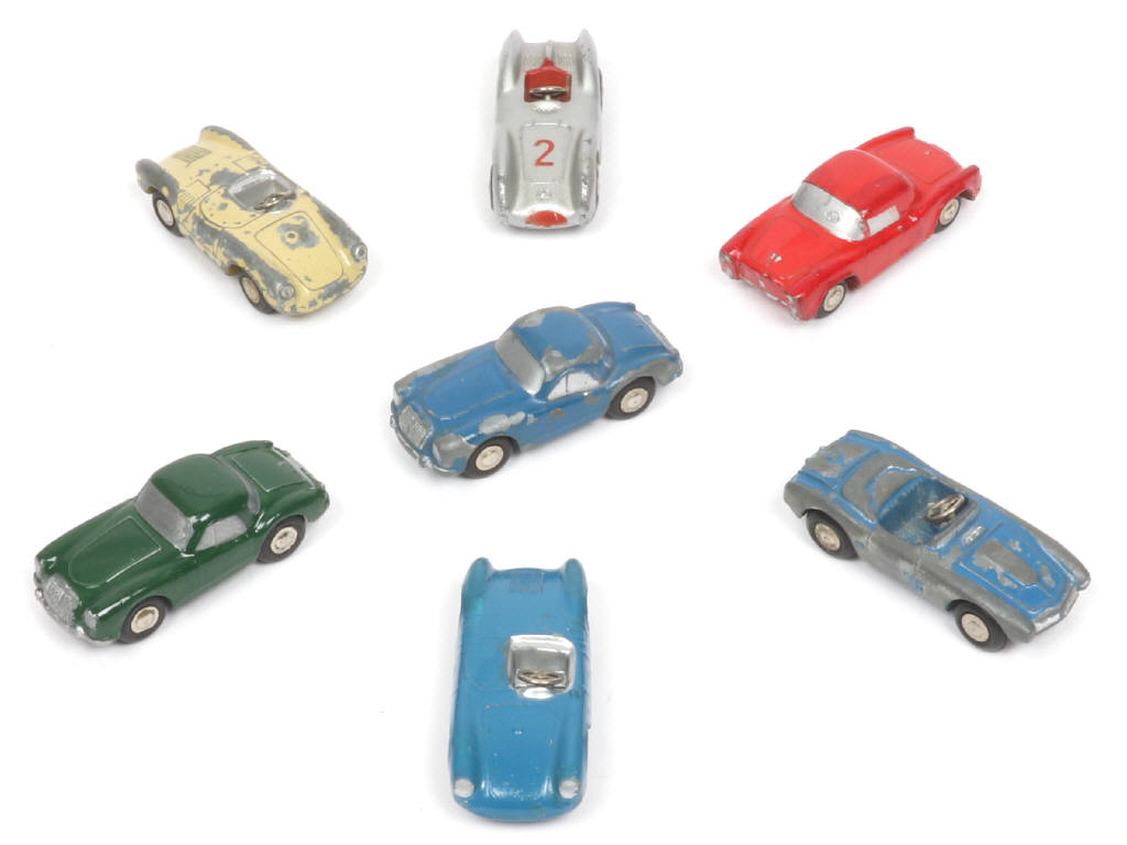 série 'PICCOLO' - modèles originaux - miniatures reproduisant les modèles : MG, PORSCHE (retouches sur un exemplaire), BMW, MERCEDES & NSU (importantes retouches)
