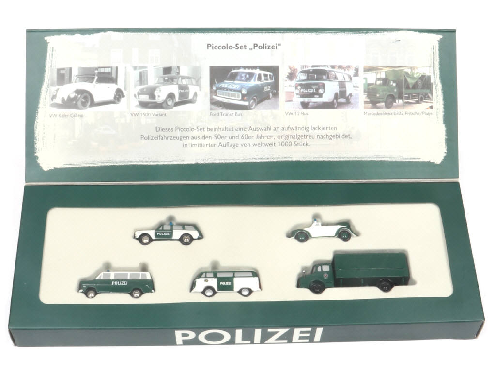 série 'PICCOLO' - série limitée à 1000 exemplaires - contient : T2 minibus 1962 - KAFER BEETLE cabriolet 1958 - 1500 VARIANT 1966 - FORD TRANSIT minibus 1953 & camion MERCEDES L322 1958
