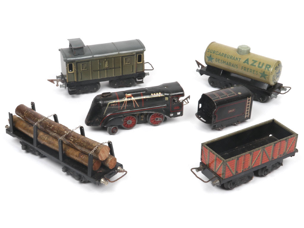 comprend notamment : locomotive type 120 SNCF avec tender (moteur électrique non testé), wagon citerne 'AZUR', tombereau & vigie - avec manques, parties cassées, oxydées & non d'origine